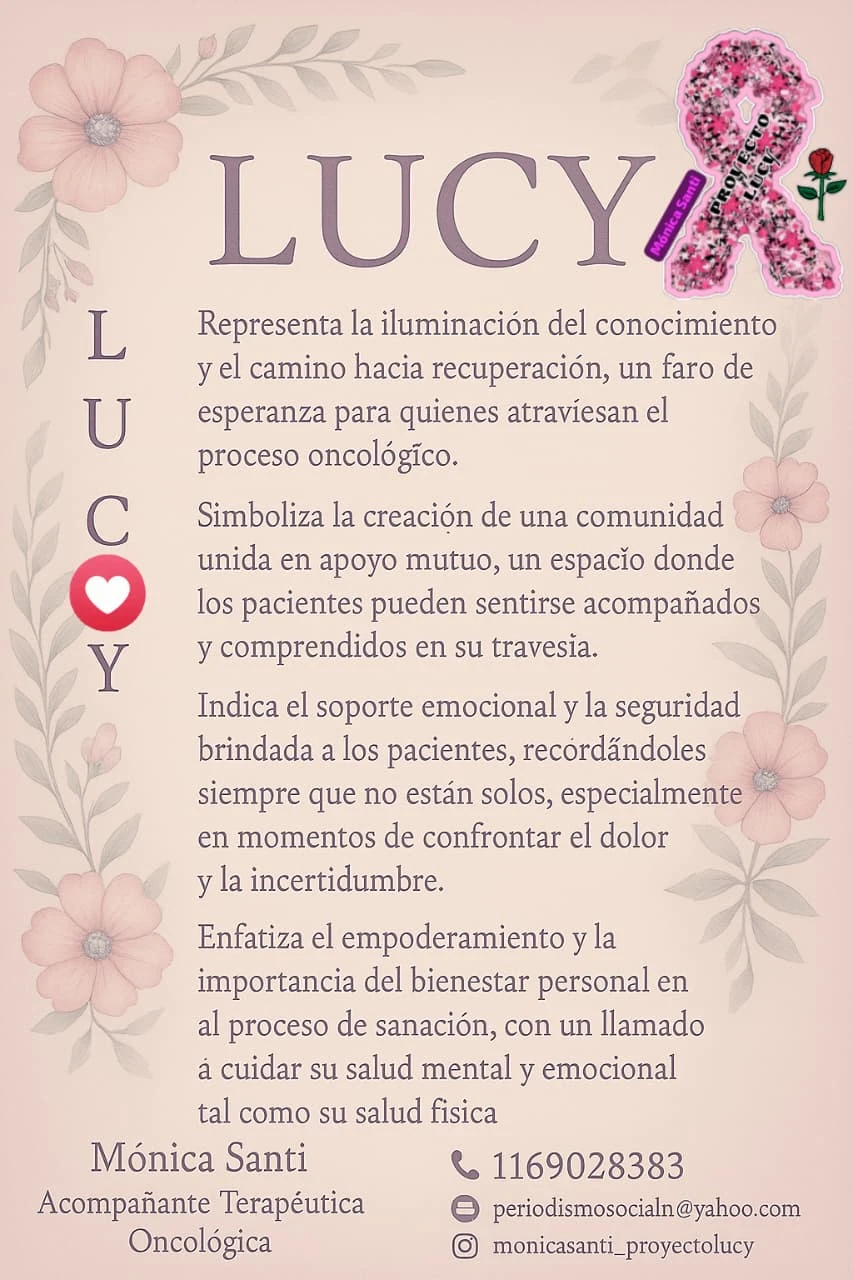 Soy creadora de Proyecto Lucy, un espacio de acompañamiento integral gratuito para mujeres con cáncer de mama, con más de 11 años de labor en el ámbito oncológico y paliativo.